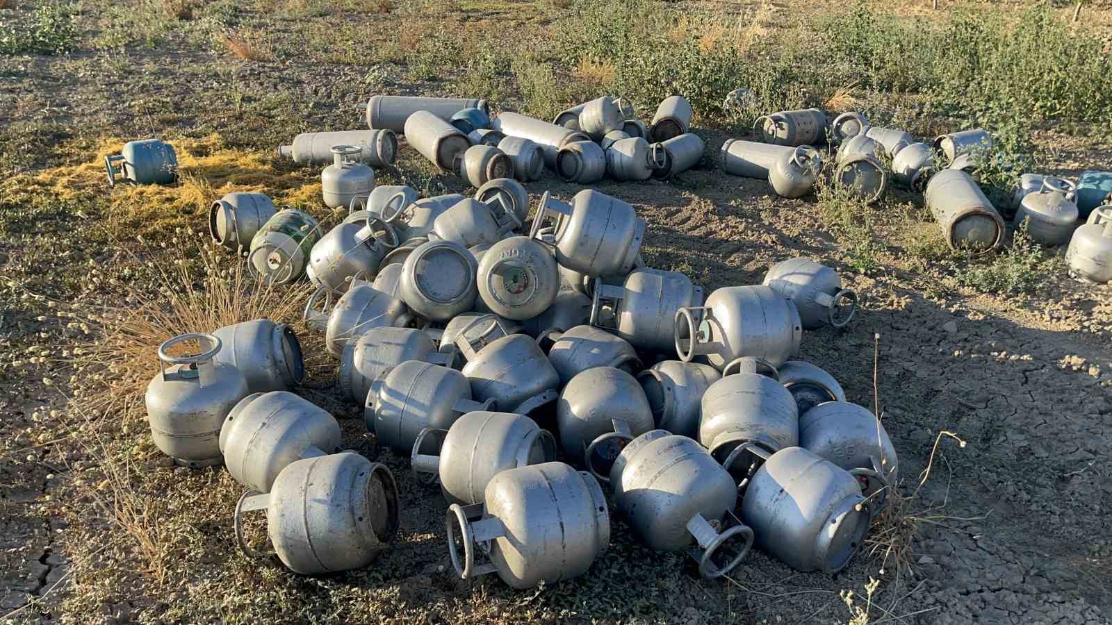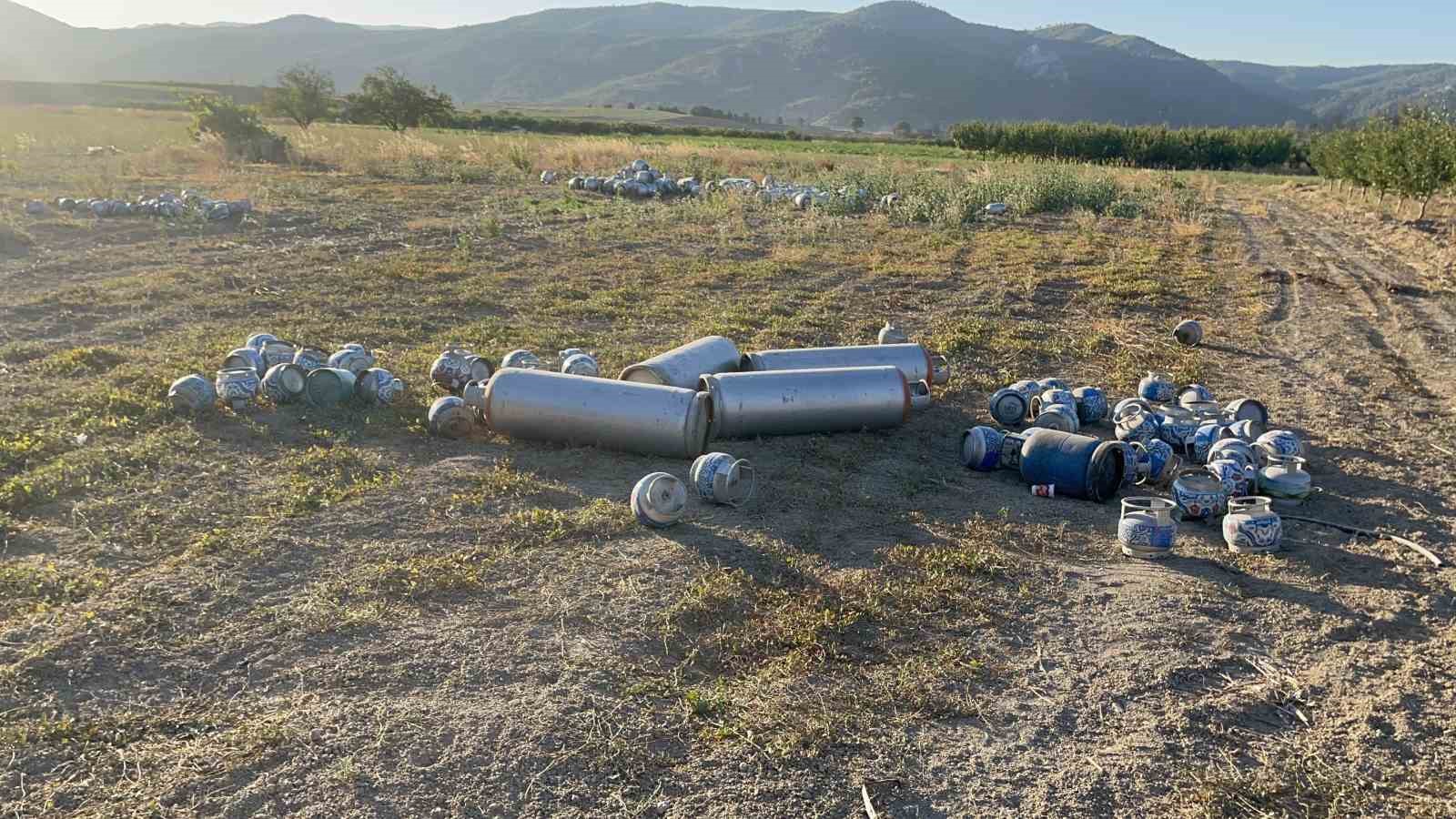 Yangın sonrası alevlerin yaklaşması üzerine boşaltılan Bilecik’in Selçik köyünde, patlama riskine karşı boş bir araziye istiflenen mutfak, piknik ve sanayi tipi onlarca tüp ilginç manzaralar oluşturdu.