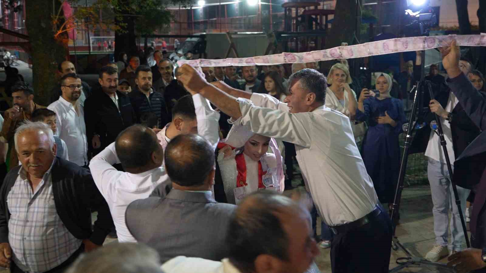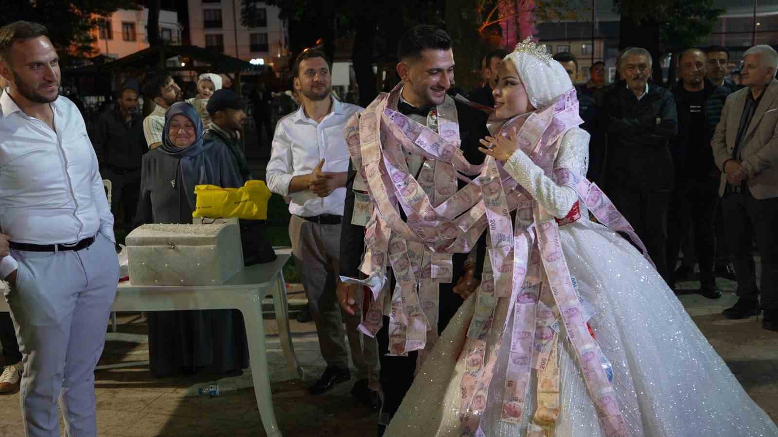Bilecik’te bir düğünde gelin ile damada boyu 15 metreye ulaşan para kurdelesi takıldı.